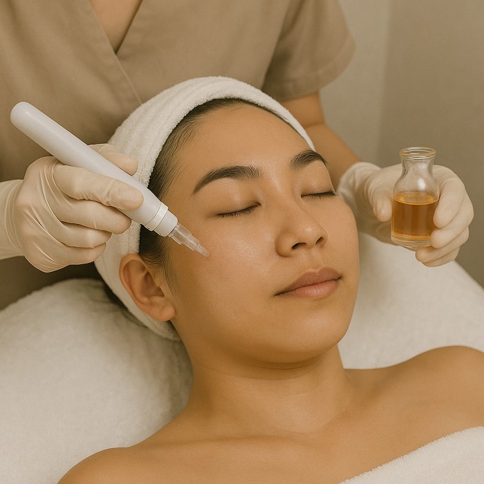 Tiến hành cấy Collagen/DNA cá hồi: Sử dụng kỹ thuật vi điểm hoặc máy chuyên dụng để đưa chất dưỡng vào sâu trong da.