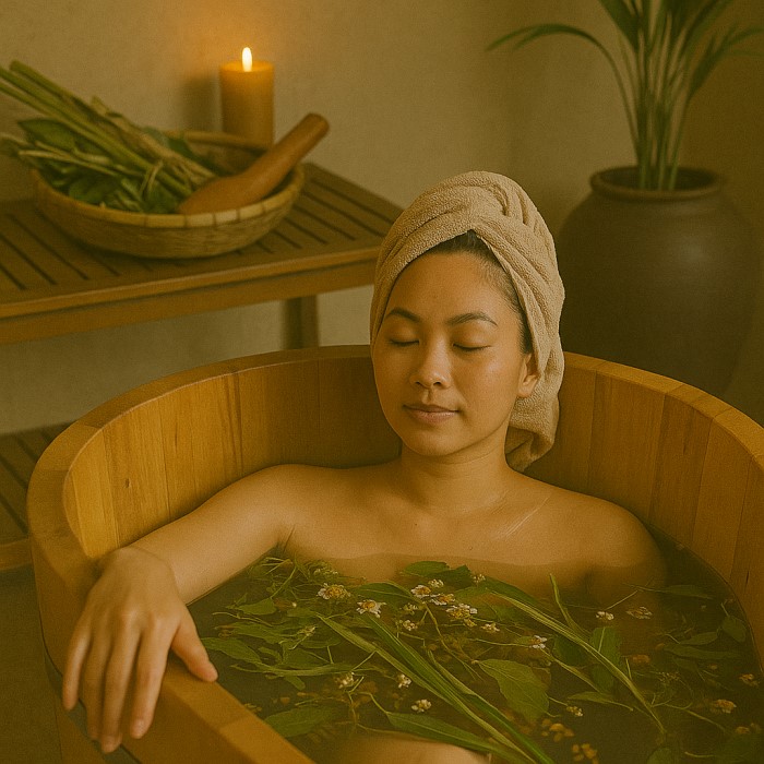 Tắm thảo dược: Ngâm mình trong bồn nước ấm pha thảo mộc, kết hợp massage nhẹ nhàng, hỗ trợ thư giãn cơ bắp.